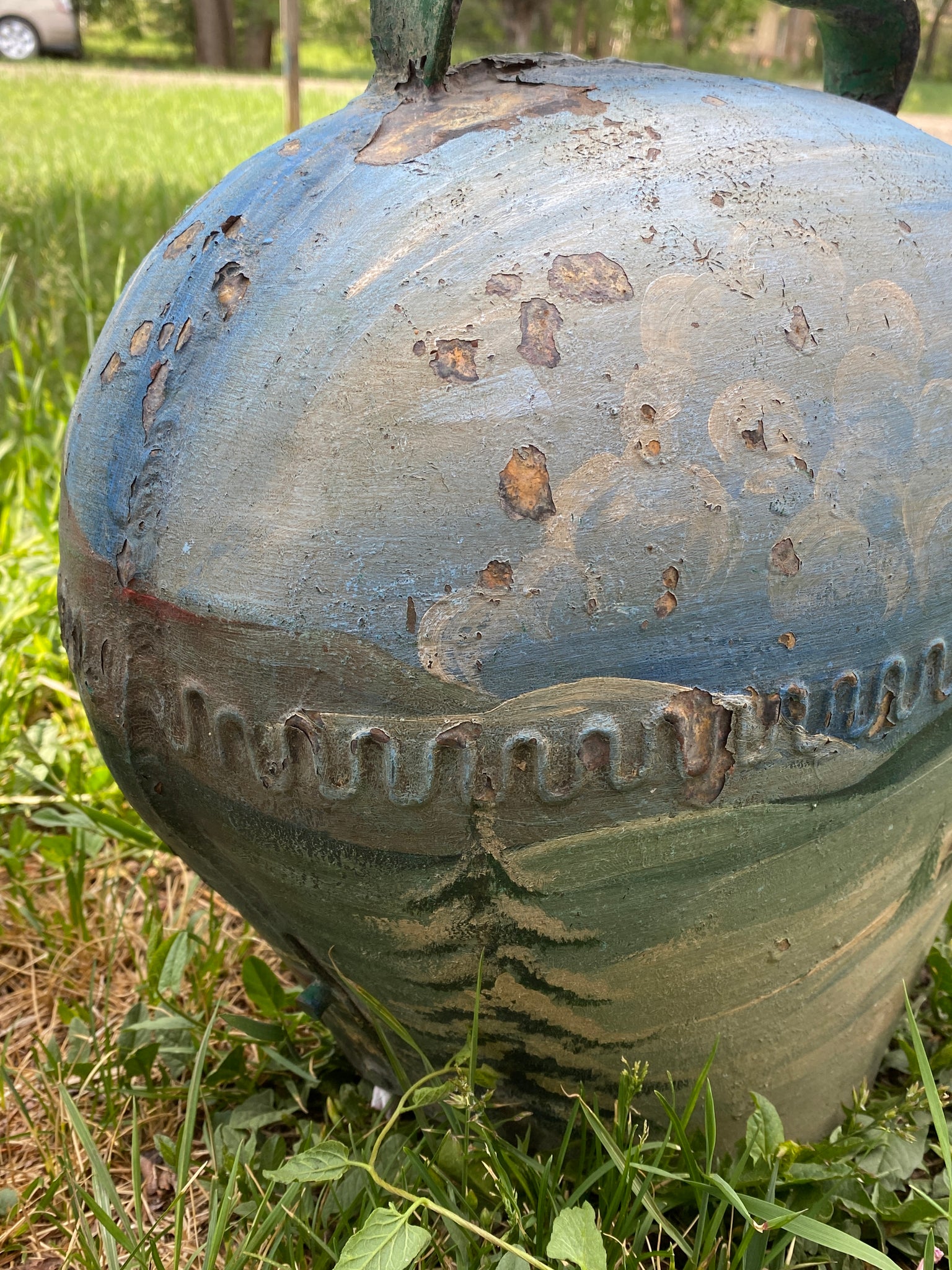 A rare, one of a kind, large Antique Swiss Cowbell. Hand-painted by an unknown artist showing seasonal Alpine village charm in Summer on one side and Winter on the other.